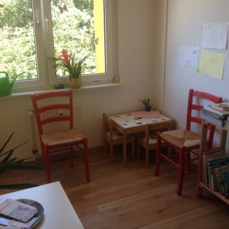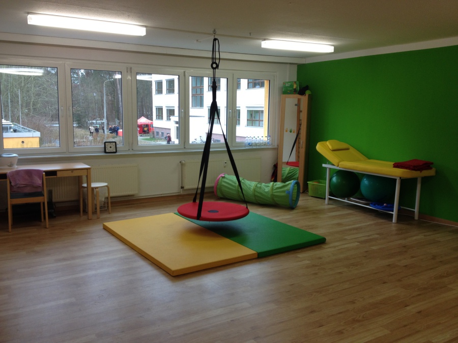 Der erste Therapieraum bietet reichlich Platz zum kreativ werden, aber auch zum konzentrierten Arbeiten. Er ist ausgestattet mit einem höhenverstellbaren Tisch, höhenverstellbaren Stühlen,
