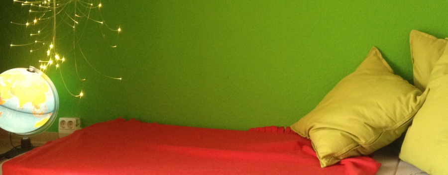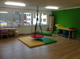 Der zweite Therapieraum wird hauptsächlich als Bewegungsraum genutzt. Ausser der Therapieliege und etlichen Medien zur Förderung der motorischen und sensorischen Fähigkeiten, verfügt der Raum über