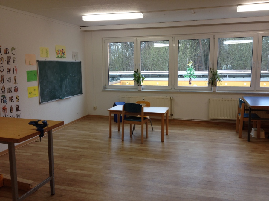 Kindertisch und -stühlen, sowie einer Werkbank.